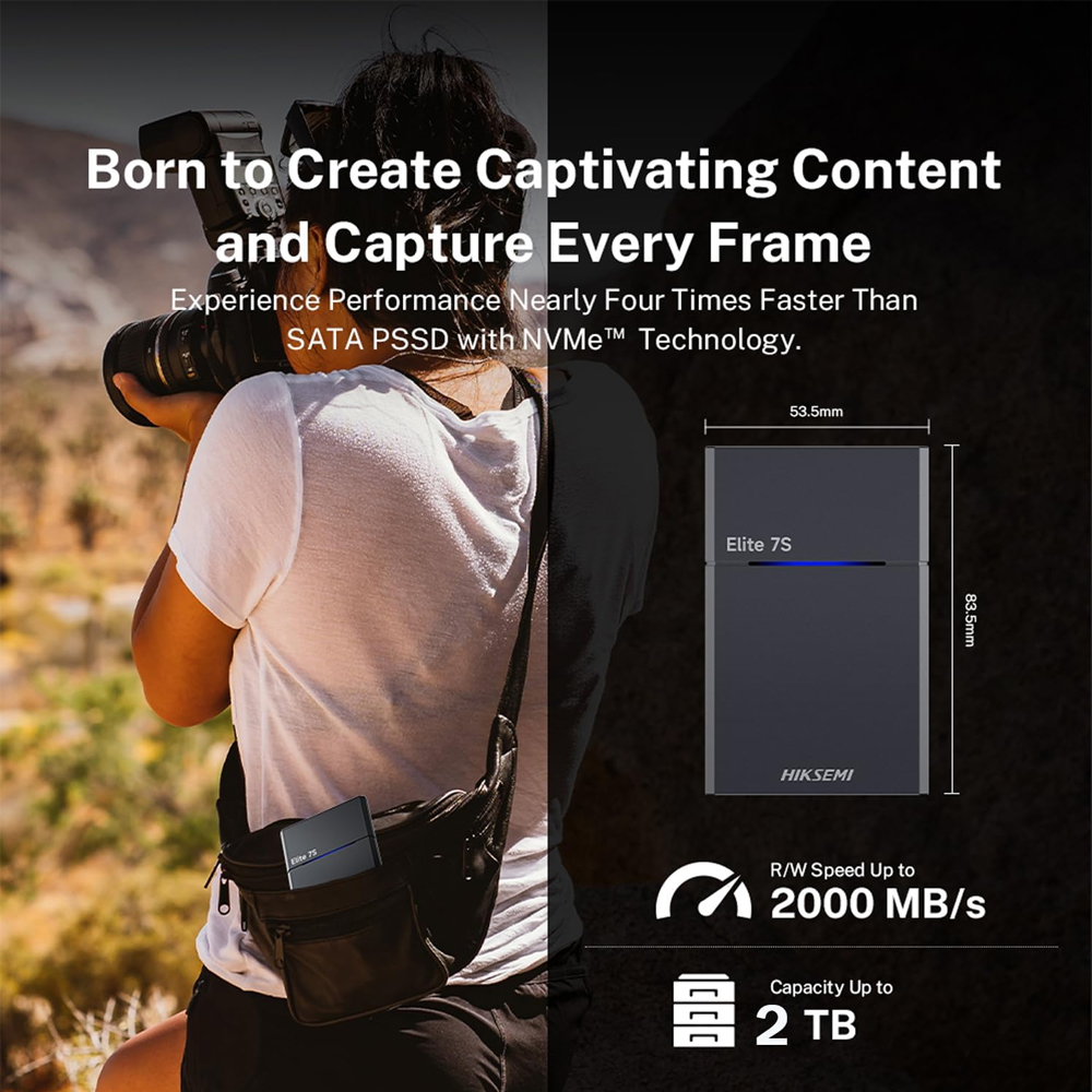 The HIKSEMI Elite 7S is a high-performance portable SSD engineered for professionals and creatives who demand speed, durability, and versatility. Harnessing the power of NVMe™ technology and a USB 3.2 Gen2x2 Type-C interface, it delivers read and write speeds up to 2000MB/s—nearly four times faster than traditional SATA SSDs.