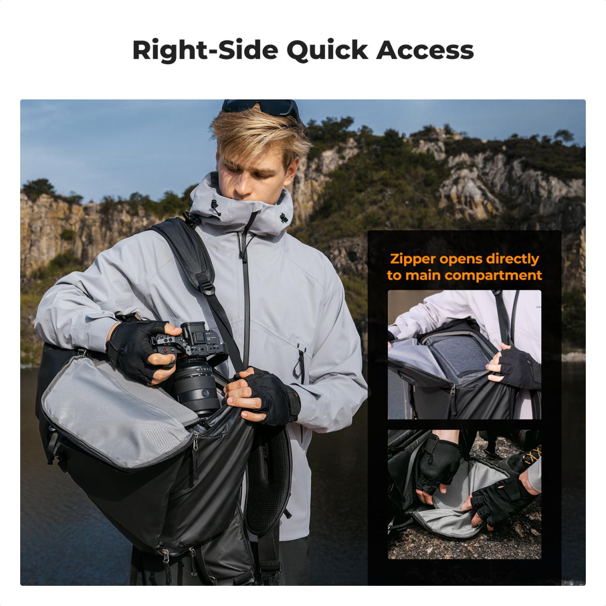 The K&F Concept KF13.206V1 is a 30L professional camera backpack offering waterproof protection and ample storage for DSLR and mirrorless gear. Its removable, customizable dividers and ergonomic design make it ideal for photographers who need both versatility and comfort on long shoots.
