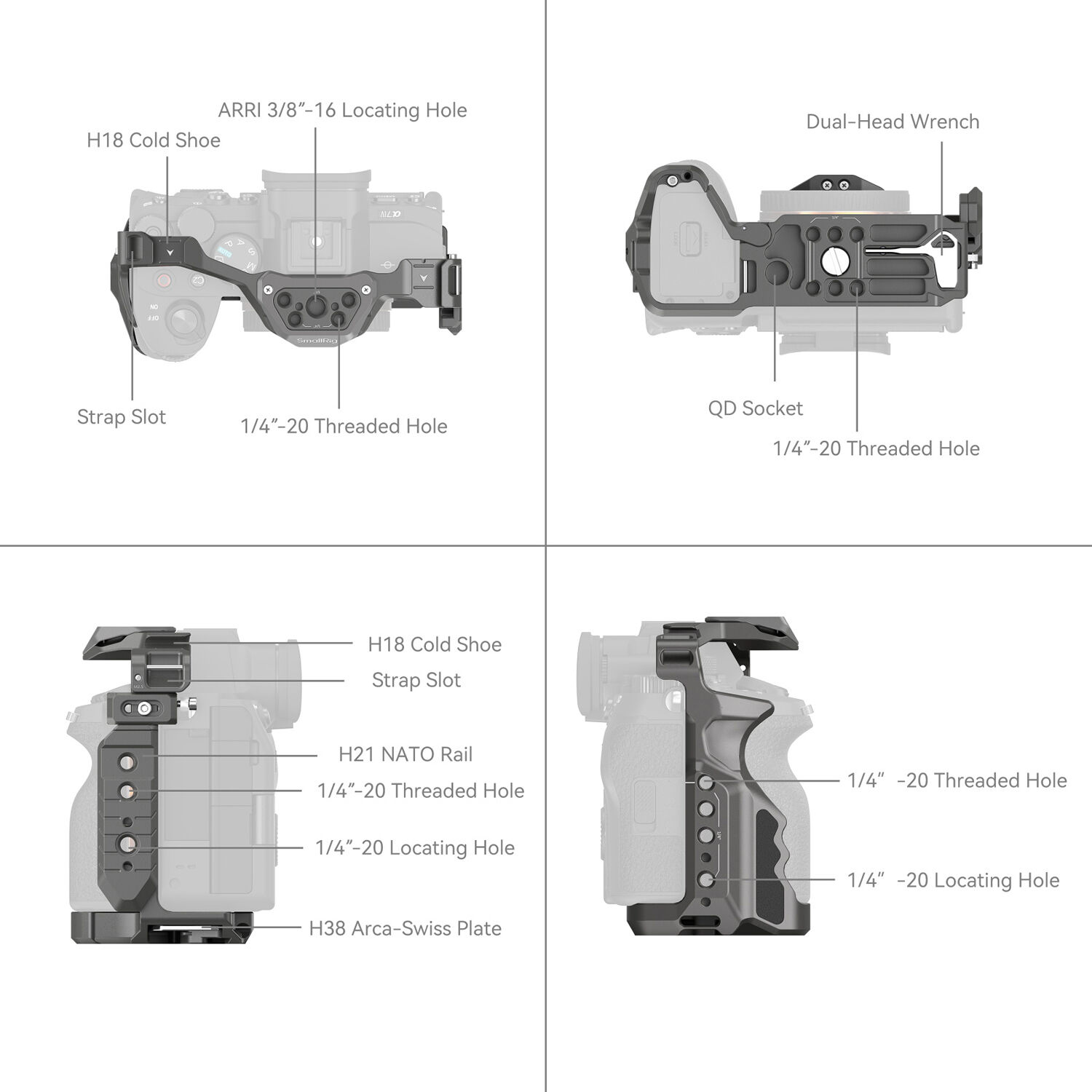 · Triple-Point Locking System: Ensures secure camera attachment using bottom locating pin, 1/4"-20 screw, and M2.5 screw.