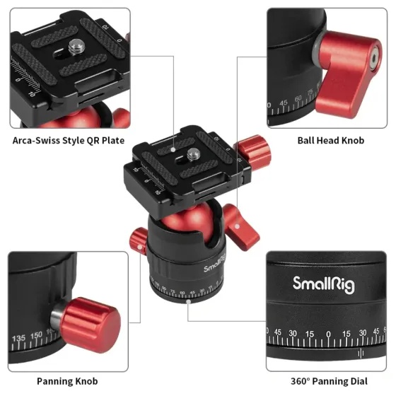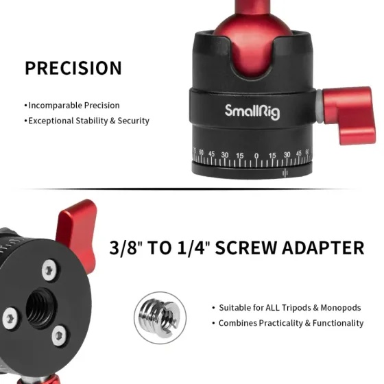 SmallRig Aluminum Panoramic Ball Head 3034, which is made of aluminum, is solid and secure. With a safety payload of 5kg, it is the perfect head for amateur photographers who need a quick, smart, and simple head for their compact DSLR, mirrorless camera, smartphone, action camera, or other devices. It’s compatible with most of the photography tripods or monopods. The ball head with accurate calibration supports 360° panoramic rotation for panoramic shooting, -90°/+45° front tilt, and -50°/+50° lateral tilt for multi-angle adjustment, including horizontal shooting and vertical shooting. It comes with a standard Arca-Swiss plate compatible with other Arca-Swiss clamps to ensure a quick mount/dismount of your device. Key Features: Panoramic head with accurate calibration and independent pan knob for panoramic photography. Ball head with knob supports multi-angle adjustment and quick switch between vertical shooting and horizontal shooting. Standard Arca-Swiss style plate compatible with other Arca-Swiss clamps ensures a quick mount/dismount of your device. The ball head holds up to 5kg. Box Included: SmallRig 3034 Aluminum Panoramic Ball Head with Quick Release Plate Arca-type Quick Release Plate 3/8"-16 to 1/4"-20 Busing Adapter