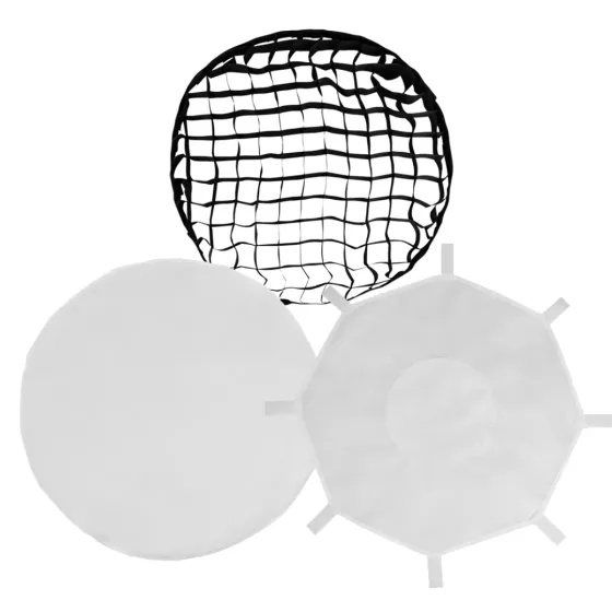 Key Specification: Develop the latest generation of quick-release chuck design, ultra-saving pressing structure, Only press and lift simplify installation and disassembly, save time and effort. Adopt high-reflective coating + Oxford lattice double fabric structure, solid outdoor grade materials, more durable; high-reflective coating, while retaining the original color temperature and CRI, give a more uniform soft light effect. 16 umbrella ribs three-dimensional support, to create a more circular surface, shape a certain depth of the surface effect. using materials from the military umbrella field, lighter and tougher, high elasticity, high-temperature resistance, can withstand tens of thousands of presses without deformation. Umbrella ribs are all externally mounted to ensure smooth and even coating on the inner side, without affecting the internal reflected light function, what’s more, umbrella bones don't come off the Velcro easily. Comes with two high-quality soft cloth and a grille, which can be freely selected according to needs. Compatibility: Includes Bracket/Speed Ring with Bowens S Mount: For Godox Box Includes: 1 x Diffusion(Internal) 1 x Diffusion(External) 1 x Honeycomb Grid 1 x User Manual 1 x Custom Carry Bag
