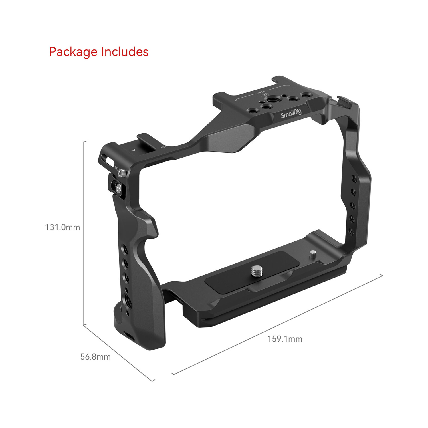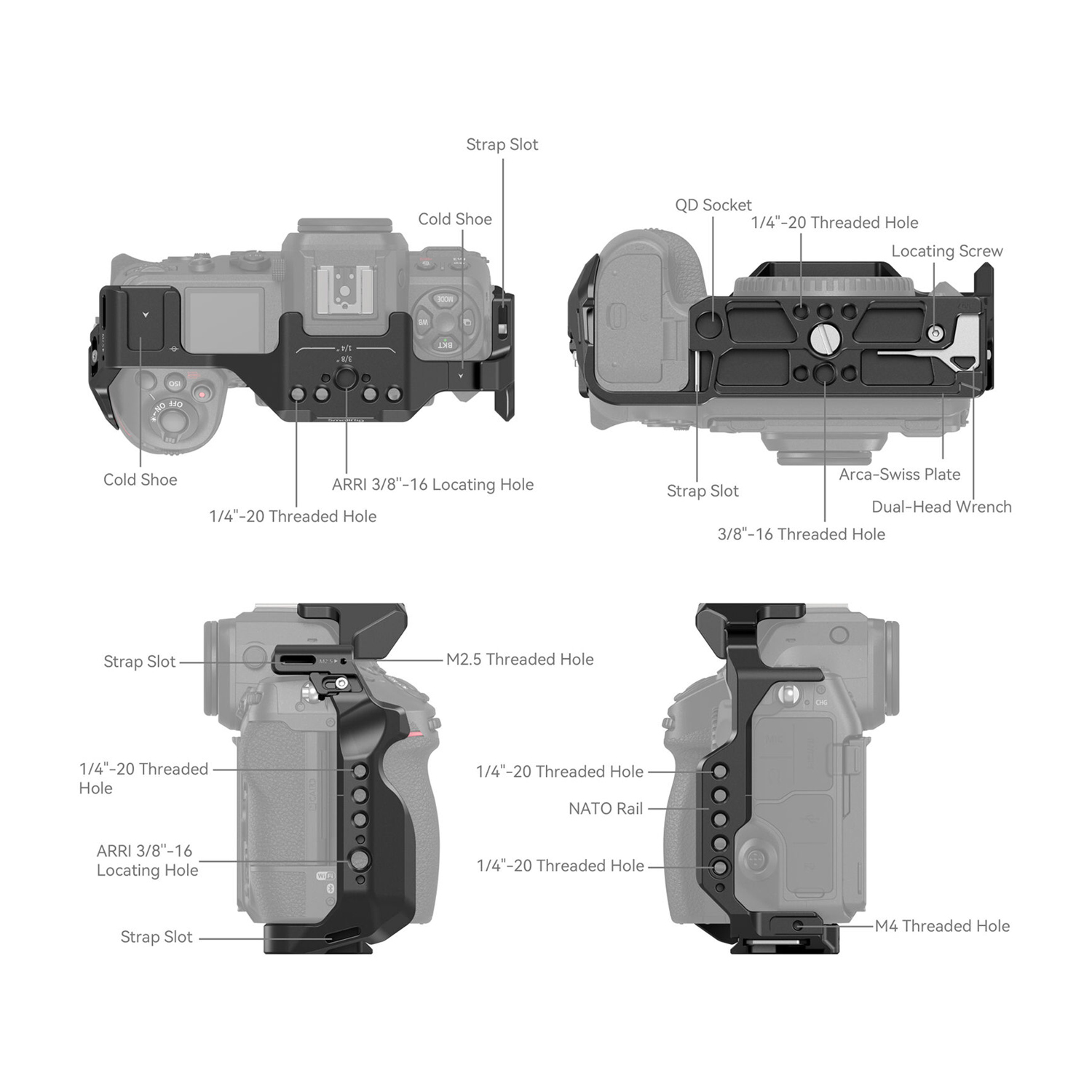 In addition to one shoe mount, a side NATO rail, and multiple 1/4"-20 and 3/8"-16 accessory threads, the cage incorporates ARRI-style locating holes for preventing accessories from twisting when mounted. There are also QD (Quick Detach) mounts and strap slots for even more options. The cage also has a built-in Arca-type quick release plate on the bottom for tripod mounting.